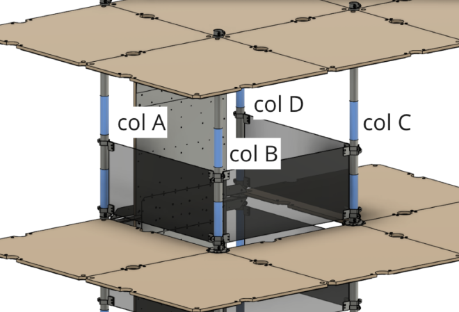 Mount additional clamps for safety panels onto Column B, so that an “angle” is formed. Now, the clamp with threaded holes must be oriented towards the center of Column C.
